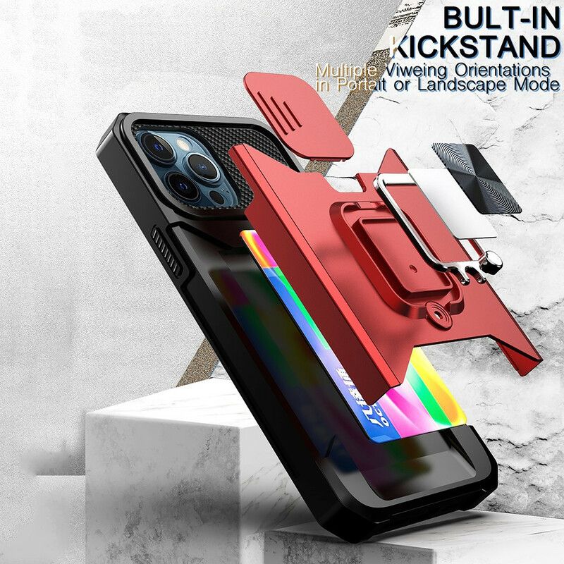 Protégez votre iPhone 13 Pro Max avec cette super coque munie d'un porte-carte, d'un anneau-support et d'un protège lentilles à glissière.