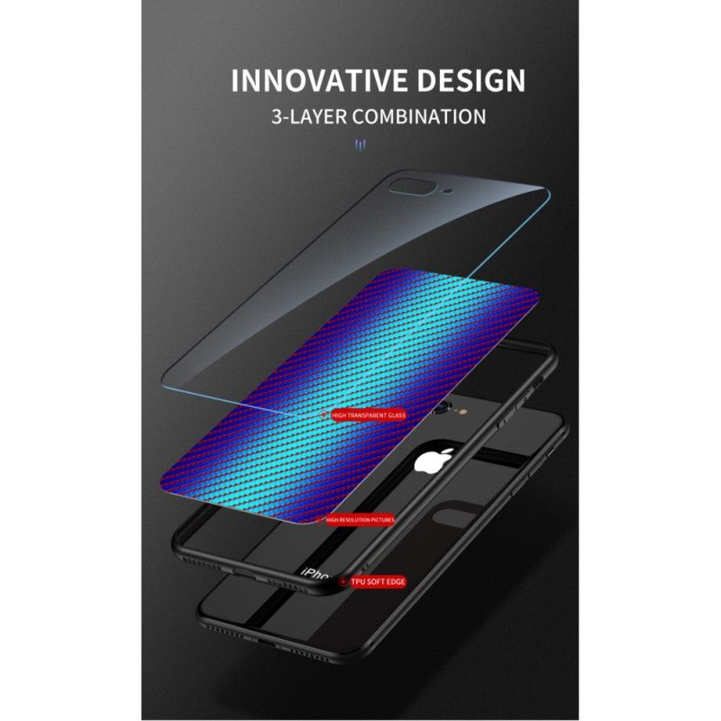 - Coque en verre trempé (dos) et rebords en silicone / texture fibre carbone