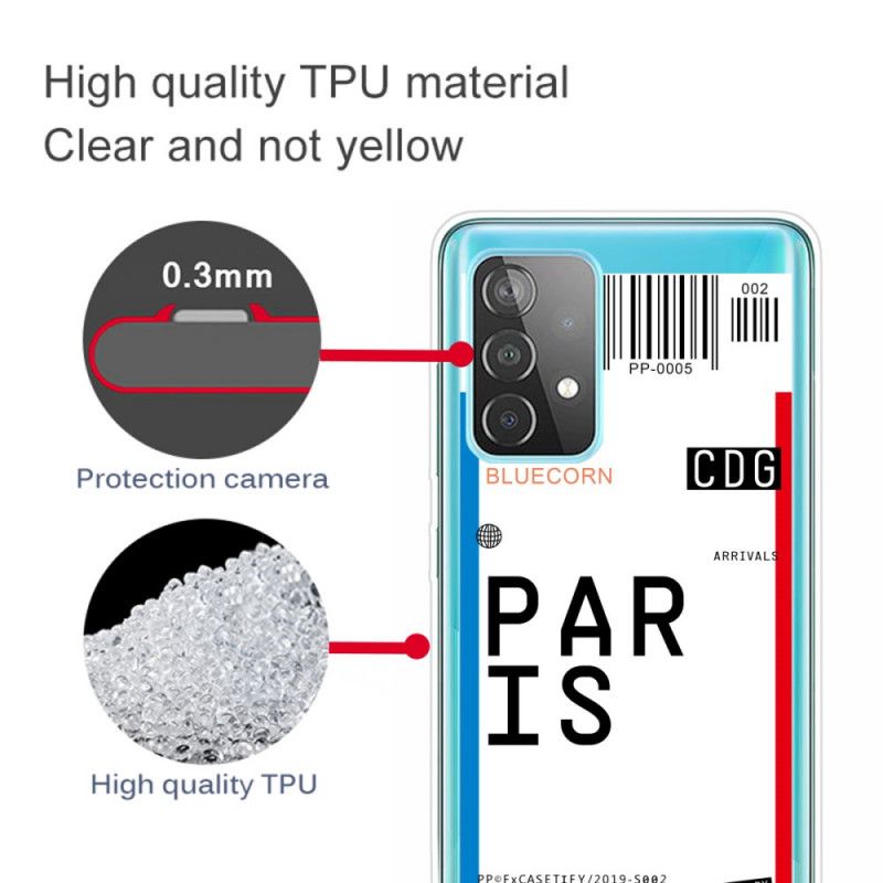 Une super coque Bording Pass to Paris en silicone avec coins renforcés pour le Samsung Galaxy A52 4G / A52 5G de tous les voyageurs.