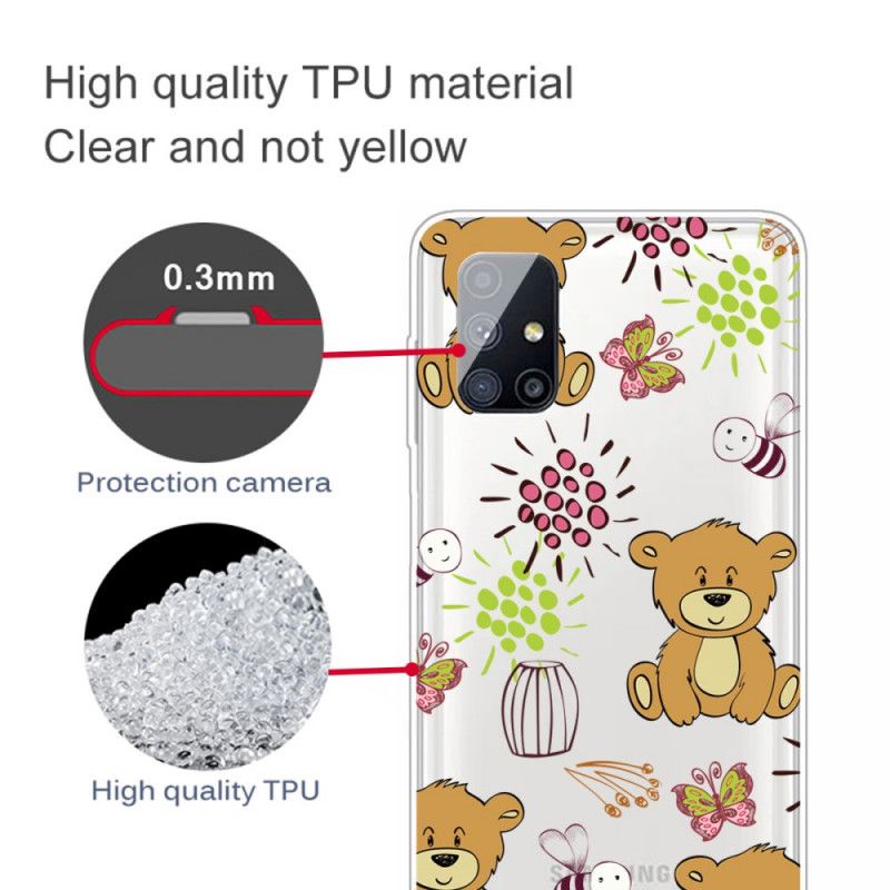 La coque Oursons Top, en silicone flexible transparent, ne laisse voir que le motif sur le Samsung Galaxy M51 et le securise parfaitement.