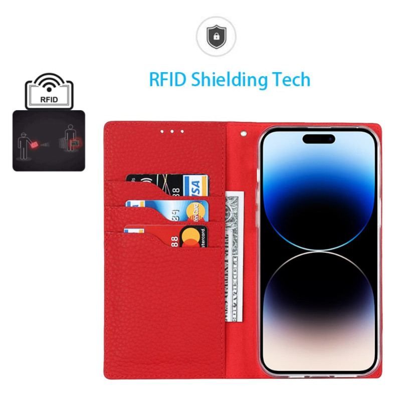 Protégez de façon élégante et résistante votre iPhone 14 Pro Max avec cette flip cover en cuir litchi véritable (avec fermoir intégré).