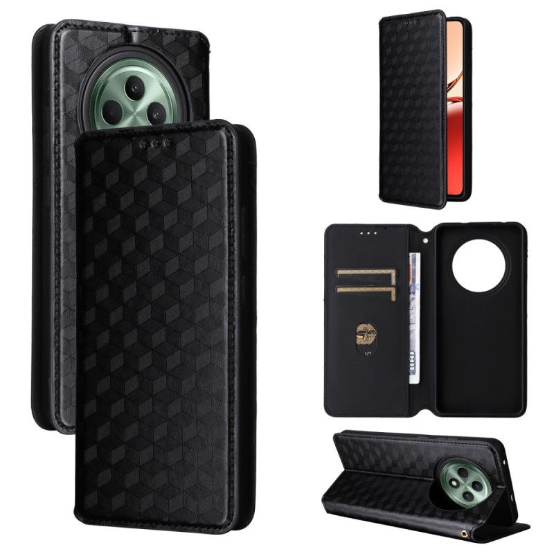 Cet étui portefeuille en cuir pour Oppo Reno 12F 5G est doté d'un motif de losange.