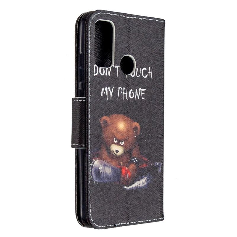 La housse Ours Dangereux, avec son slogant "don't touch my phone", protège l'ensemble du Huawei P Smart 2020 et sert de portefeuille.