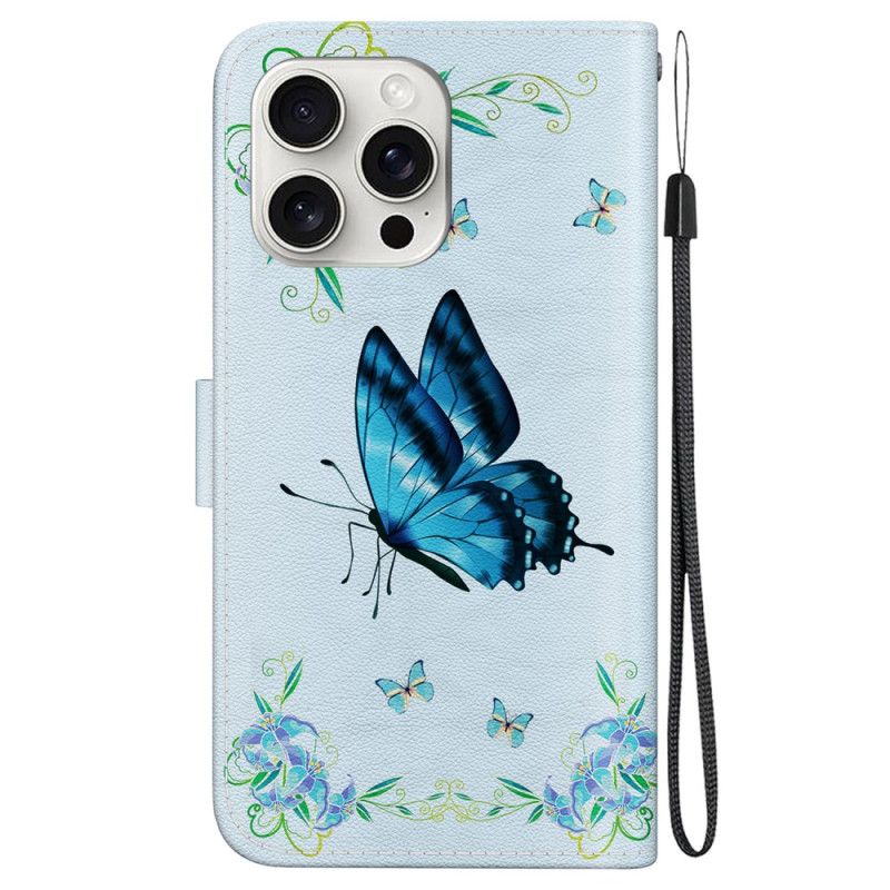 Housse iPhone 16 Pro Papillon Bleu et Fleurs à Lanière
