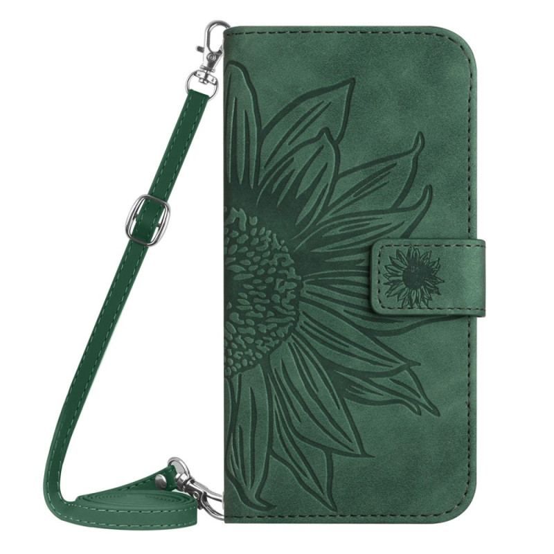 La housse en simili cuir aux motifs d'un tournesol vient avec une bandoulière ajustable pour transporter le Sony Xperia 1 IV facilement.