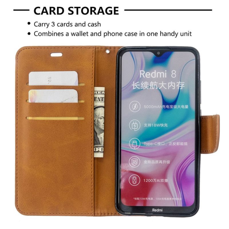 La housse Effet Cuir Coloré sécurise parfaitement le Xiaomi Redmi 8 tout en servant de portefeuille (avec une lanière jointe).